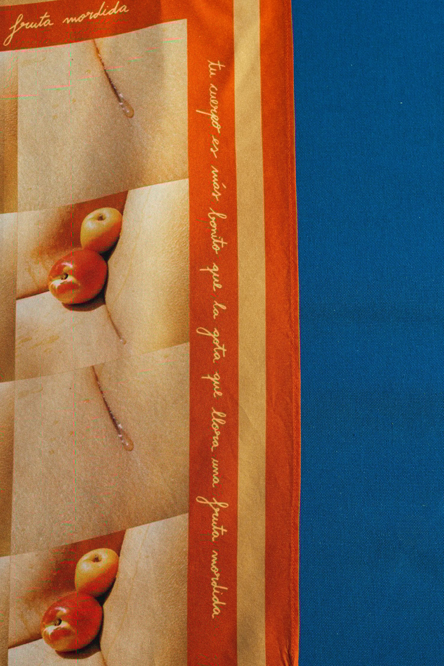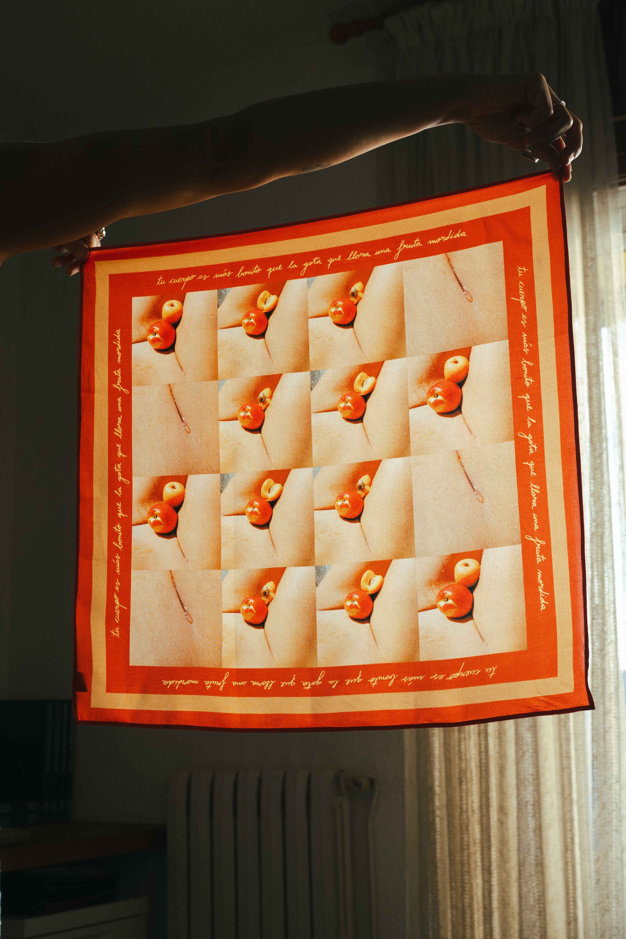 Pañuelo de seda 100% natural. Producido en Matadepera. Primera edición limitada. 10 unidades. Medidas: 60x60cm Diseño en mosaico. Fotografías analógicas y poesía de Mònica Figueras Domènech y Carla Cervantes Caro.